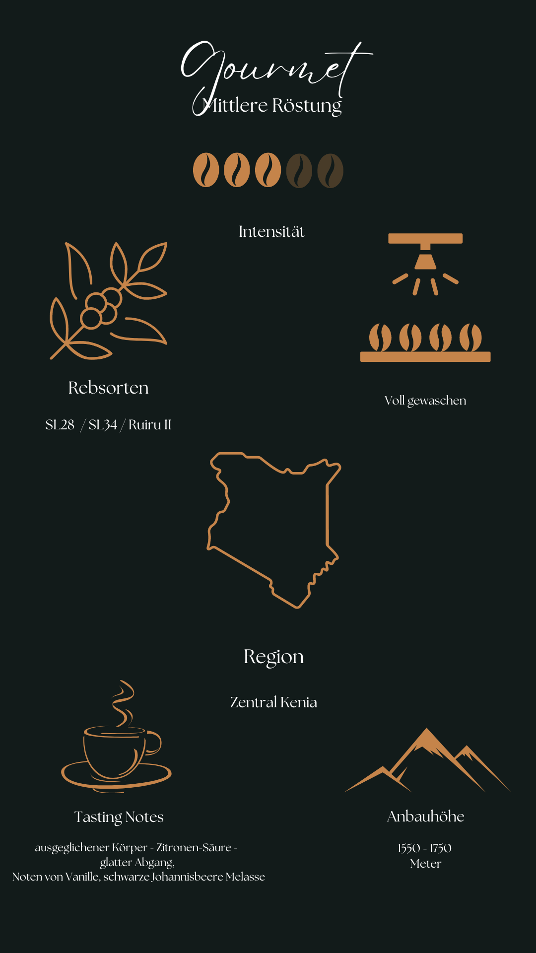 Dieser Kaffee stammt von einigen der führenden Kooperativen in Kirinyaga und ist typisch für das kenianische Hochland – komplex und süß. Die Bauern pflücken die Kirschen nur morgens, eine Anspielung auf starke landwirtschaftliche Traditionen, die diesen Kaffee einzigartig machen.